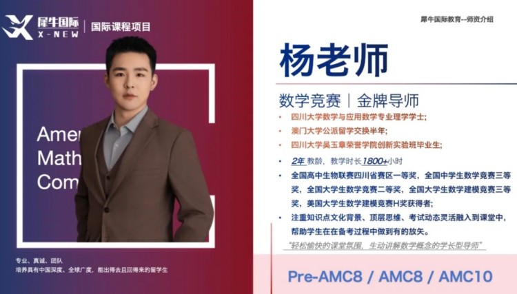 名校背景:犀牛成都校区的amc8师资背景实力强大,包括华盛顿大学、悉尼大学、曼彻斯特等学校毕业的老师。